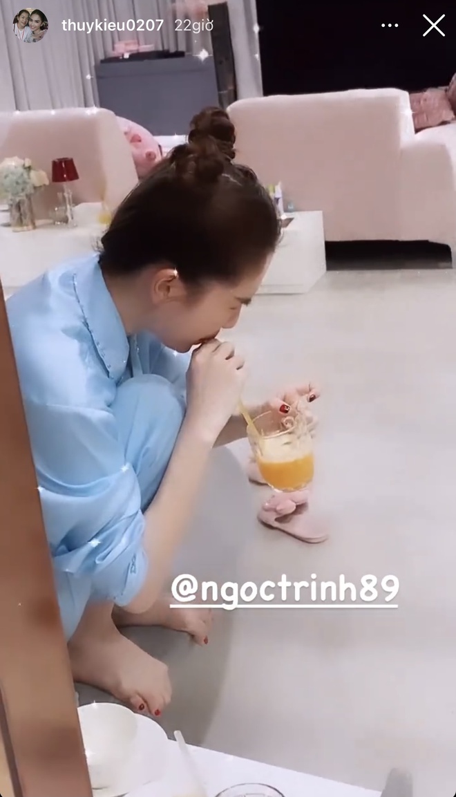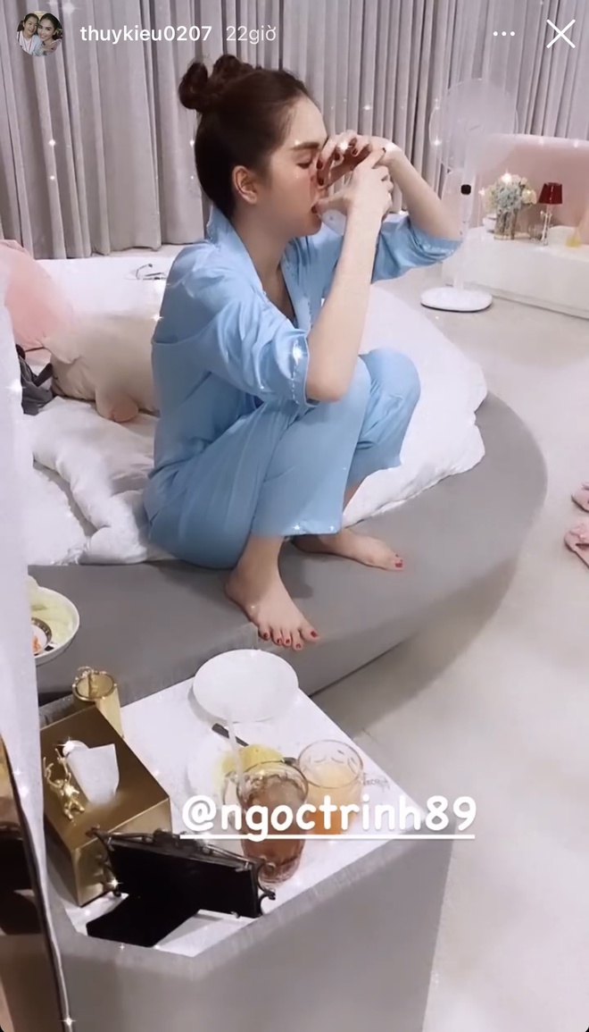 Là một trong những người rất gắn bó với Ngọc Trinh, Thuý Kiều thường hay chia sẻ những khoảnh khắc đời thường của "chủ tịch" khiến người xem vô cùng thích thú. Mới đây, cũng thông qua story của cô trợ lý, người xem bắt gặp một hình ảnh vừa buồn cười vừa thương khi Ngọc Trinh nhăn nhó vì uống một bát nước.