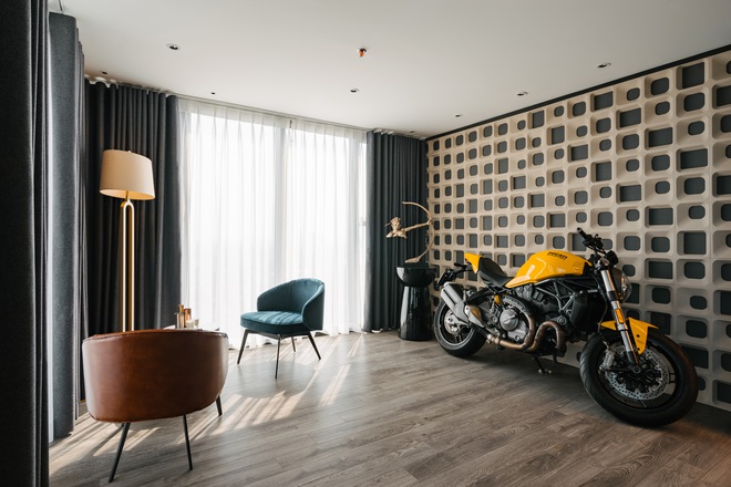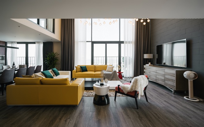 Căn hộ này là một căn duplex ở tầng 16 của tòa Pentstudio Hồ Tây, có tổng diện tích thiết kế khoảng 210m2. Điểm đắt giá của căn hộ là có 2 mặt thoáng, một mặt là view ra cầu Nhật Tân rất đẹp nên đây cũng là điểm mà kiến trúc sư khai thác tối đa để đưa vào không gian sử dụng.