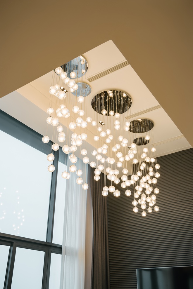 Ở phòng khách, các hệ thống đèn downlight (đèn để lắp vào các lỗ trên trần nhà) ban đầu được đổi thành đèn spotlight (đèn led chiếu điểm tập trung ánh sáng vào khu vực nhất định, làm nổi bật vẻ lung linh của chủ thể).