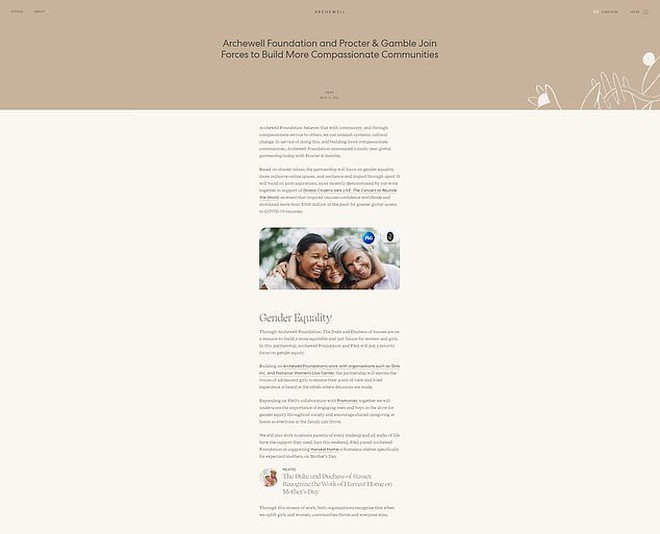 Trang Archewell cho biết: "Archewell Foundation tin rằng, với những hành động nhân ái với cộng đồng xung quanh, chúng ta có thể mang đến sự thay đổi trong văn hóa hành xử. Để thực hiện điều này và xây dựng cộng đồng nhân ái hơn, Archewell Foundation xin công bố mối quan hệ đối tác toàn cầu kéo dài nhiều năm với Procter & Gamble. Đây sẽ là bước đi giúp tiếng nói của nữ giới đặc biệt trong giới trẻ sẽ được lắng nghe và coi trọng".