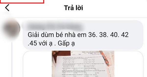 Cụ thể vào khoảng 15h50 (vẫn trong thời gian thí sinh làm bài thi), người này bình luận một hình ảnh được cho là đề thi môn Toán: "Giải giùm bé nhà em câu 36, 38, 40, 41 với ạ. Gấp ạ". Đáng nói là hình ảnh được chụp vẫn được đặt trên bàn phòng thi và còn nguyên số báo danh lẫn phiếu trả lời trắc nghiệm của thí sinh đó.