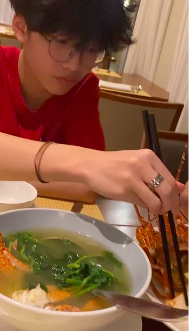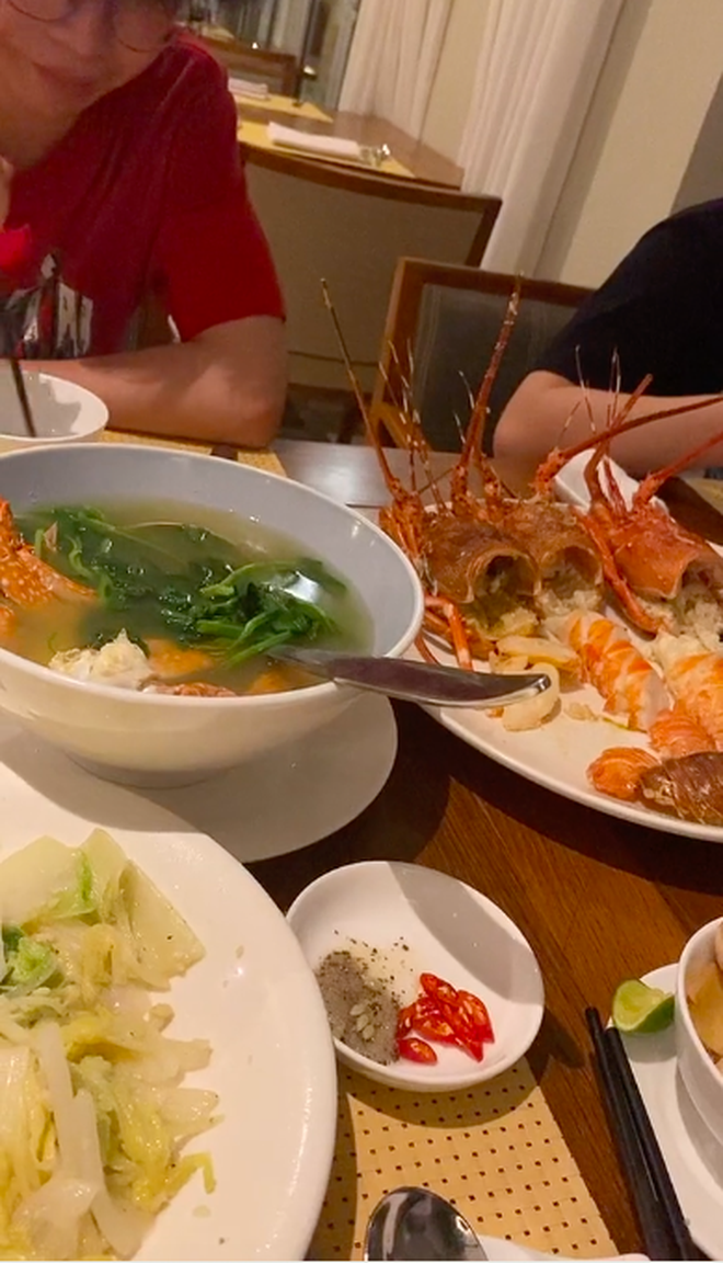 Điều đáng nói là các món ăn kèm lại khác xa với những gì chúng ta thường tưởng tượng về những bữa cơm Việt. Danh sách món ăn "sương sương" có nguyên đĩa tôm hùm to bự. Canh rau trông thì đạm bạc nhưng thực chất ở trong cũng có nguyên con cua to đùng, chắc là dòng cua Alaska hay gì đó thì mới có màu cam như vậy.