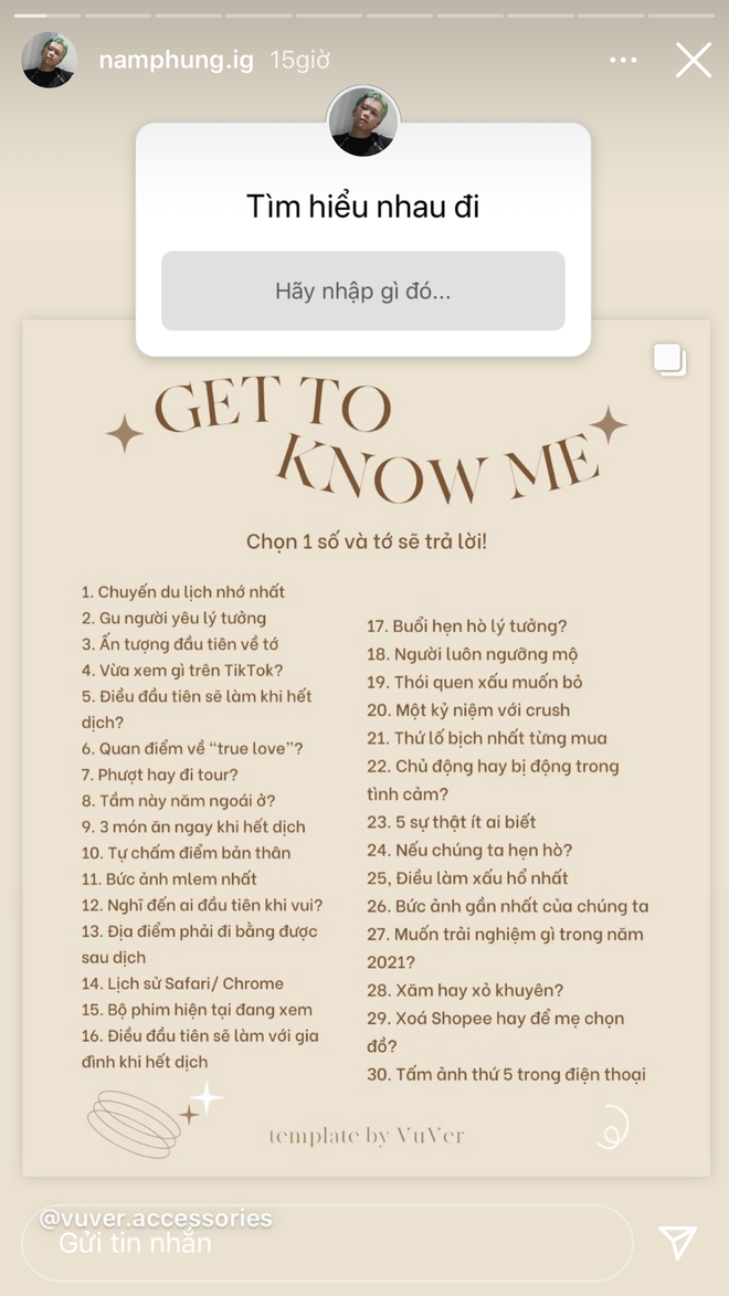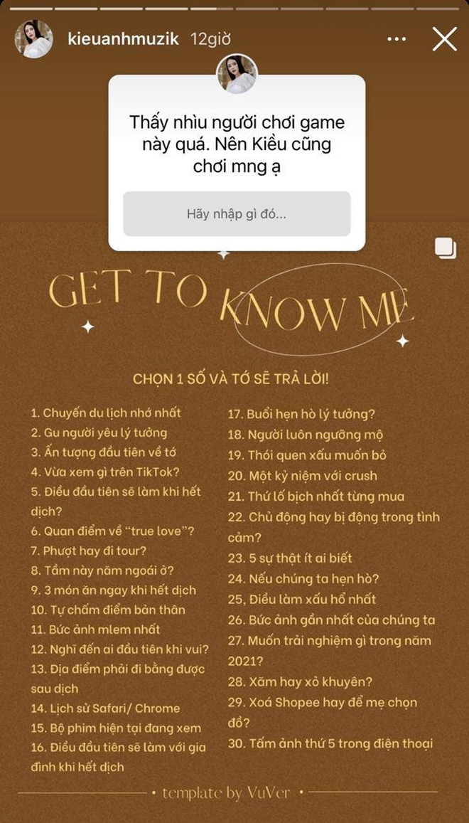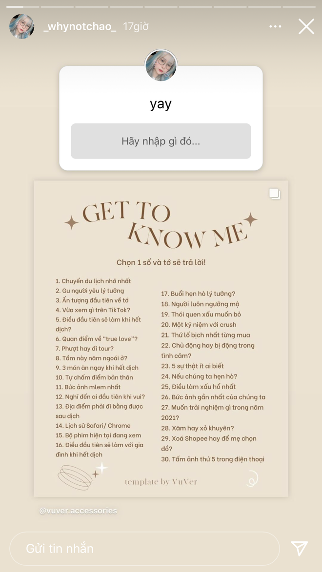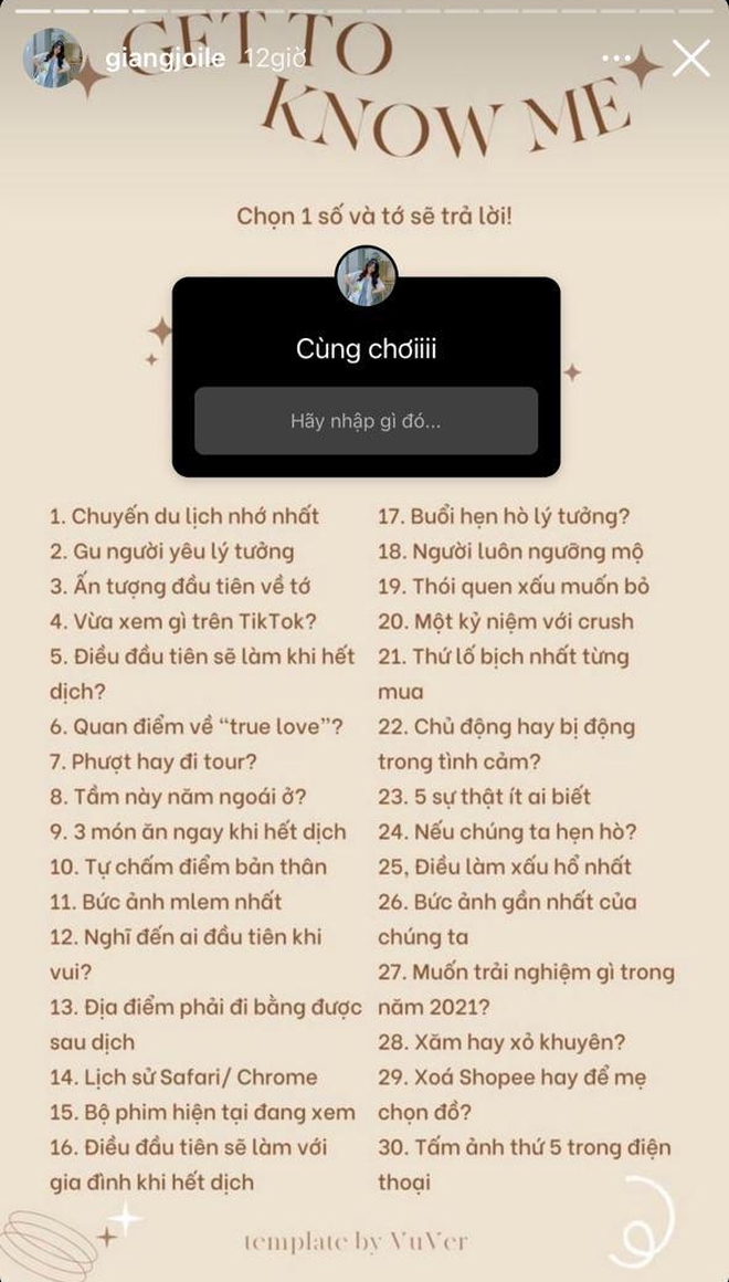 Cho những người chơi hệ "tối cổ" thì đây là bộ câu hỏi được đánh số, mỗi người sẽ đăng lên story, ai muốn hỏi han, tìm hiểu gì thì xin mời để số lại, khổ chủ sẽ giải đáp. Thật ra trò chơi này không hề mới mẻ một chút nào nhưng có vẻ như vì đang dư dả thời gian nên dân tình hưởng ứng khá nhiệt tình, kể cả những nhân vật đình đám cõi mạng.
