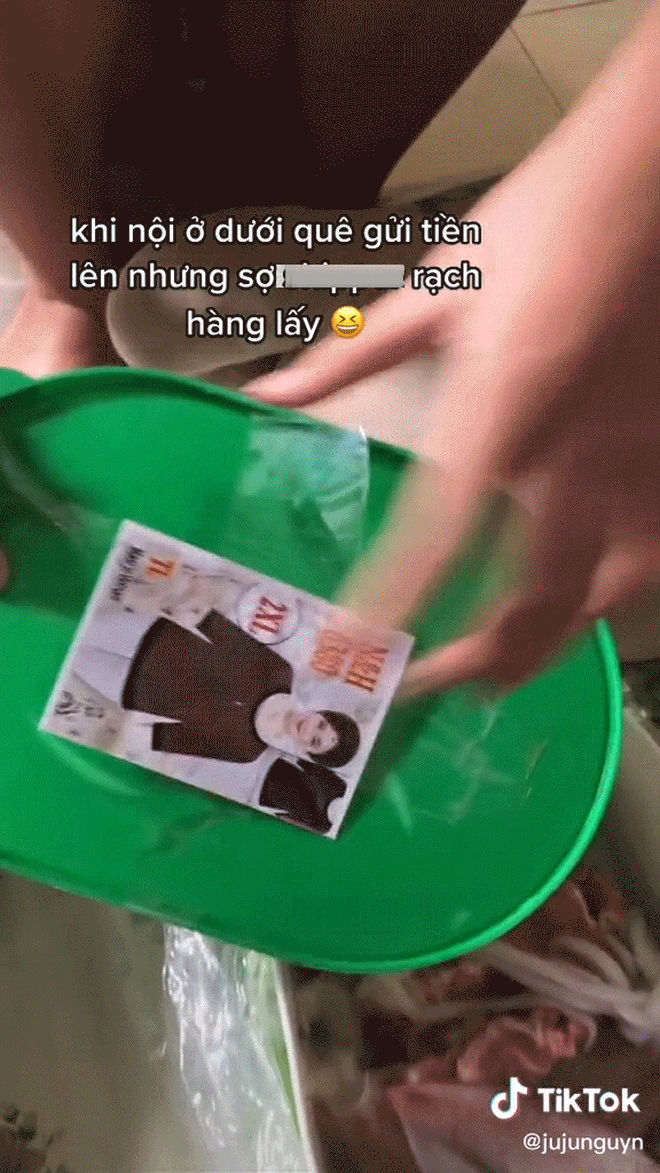 Vì không chỉ gửi đồ ăn mà còn gửi cả tiền, nội lo sợ cho an toàn của số tiền này nên đã đóng gói theo cách vô cùng sáng tạo. Nội gói vào một chiếc túi nilon nhỏ rồi... dán nên nắp hộp đựng đồ ăn. Sau đó còn cẩn thận dán thêm một lớp giấy bảo vệ nữa. Vậy là khi mở hộp ra, nếu không được chỉ dẫn, hầu như không ai biết rằng còn có tiền đang dính trên nắp hộp.