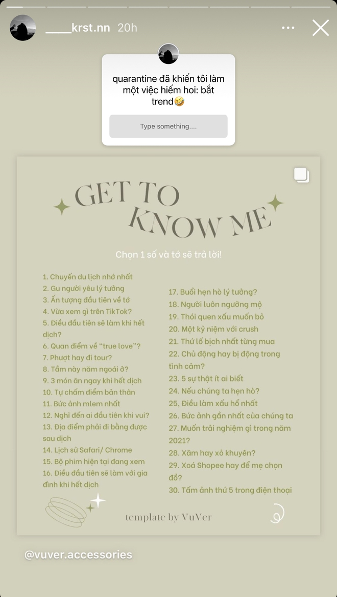 Nếu bạn đang ở nhà rất nhiều và là một người chơi hệ MXH đích thực thì không khó để bạn nhận ra những ngày này, bộ câu hỏi Get to know me (tạm dịch: Làm quen với tôi) đã "xâm chiếm" story của tất cả chúng ta. Khắp nơi nơi, bạn đều thấy dân tình trả lời các thắc mắc về bản thân theo list câu hỏi có sẵn kiểu thói quen xấu, gu người yêu, quan điểm về "true love"...