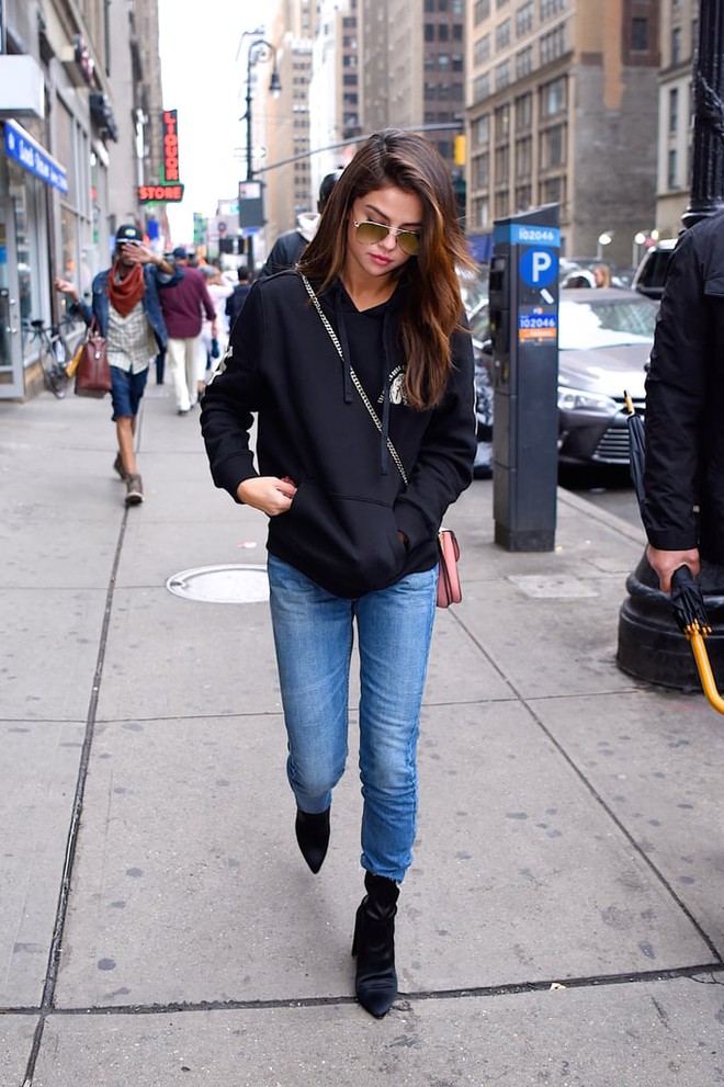 Từ khi quen The Weeknd, chàng ca sĩ có phong cách streetwear đơn sắc, bụi bặm và có phần đơn giản, dễ thấy phong cách của Selena cũng ít nhiều bị ảnh hưởng. Cô thường ra đường với jacket da, áo phông graphic dáng rộng, áo bóng chày, jeans rách, khuyên tai loop bản to hay boot da.