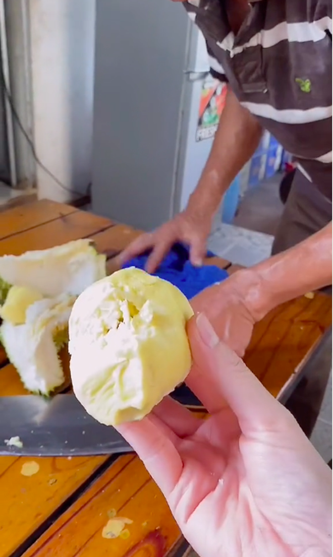 Trái sầu riêng mà cô gái mang vào nhà xẻ ra ăn có trọng lượng khoảng 2kg, hình dáng không được đẹp mắt cho lắm. Lúc xẻ ra, cô xác định đây là sầu riêng Thái dù ban đầu nhà trồng giống Ri6. Múi sầu riêng Thái mà cô đang ăn sẽ khá to, khô ráo, rất dẻo và ngọt.