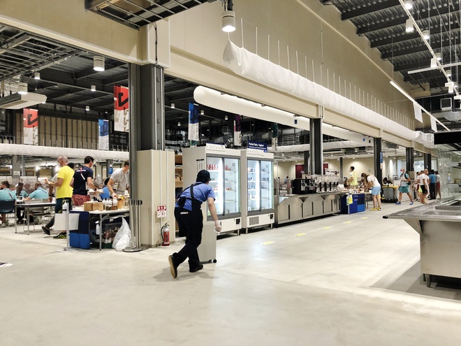 Sau khi đi thang máy lên tầng 2 là sẽ tới ngay khu vực nhà ăn, mỗi VĐV tự chuẩn bị khay, giấy, bao tay, đồ dùng ăn uống…