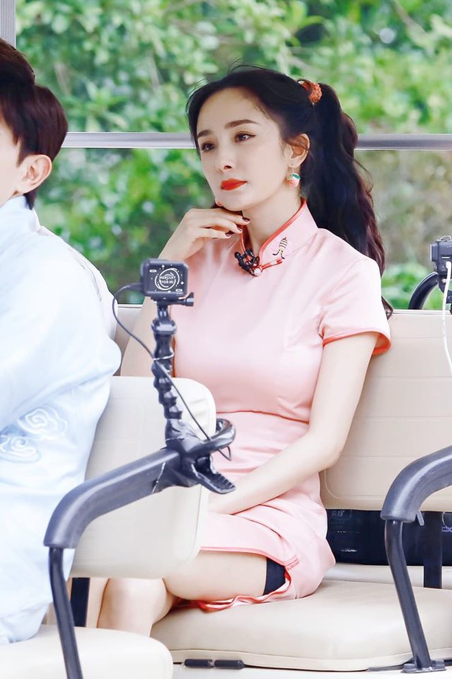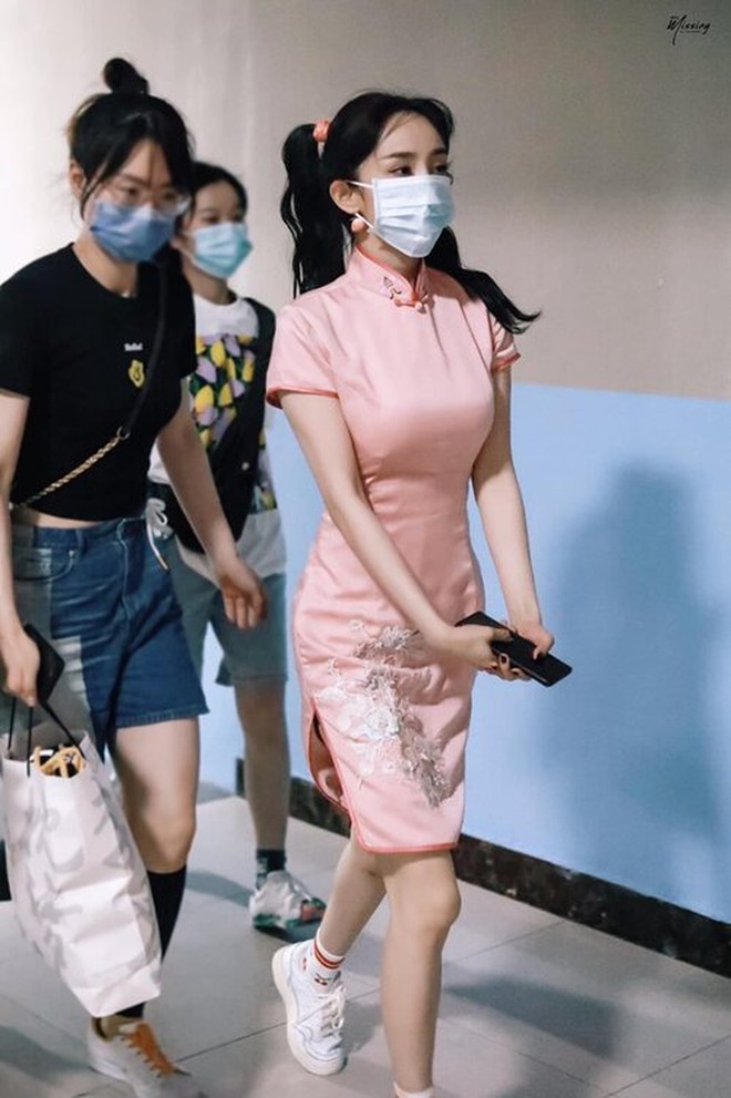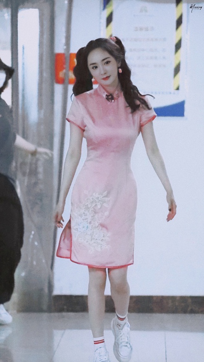 Cũng chọn bộ sườn xám cách tân nhưng Dương Mịch chọn sắc hồng xinh xắn, lại còn cột tóc hai bên trông cũng "hack" tuổi lắm. Bộ sườn xám tuy không ôm sát nhưng vẫn khoe được "đồi núi" trập trùng, cực kỳ gợi cảm của bà mẹ một con. Tuy vậy, tổng thể vẫn chưa thể nhận điểm 10 tròn trĩnh vì đôi sneaker kia, ít nhất là trong mắt netizen