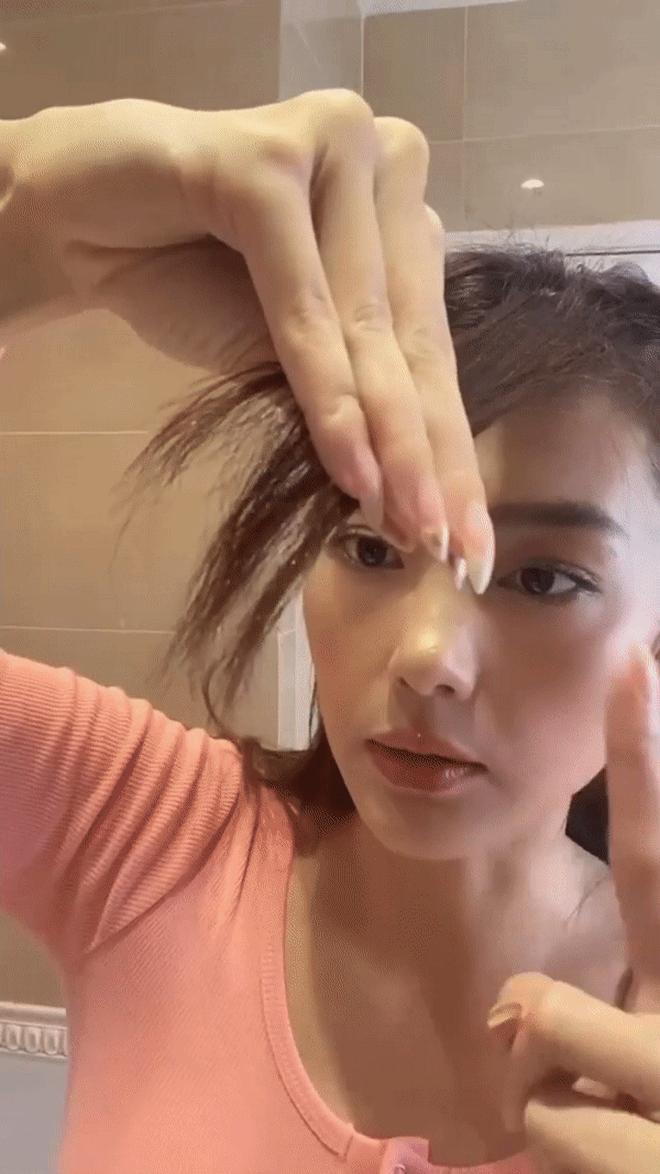 Bước 1: Chia phần tóc mái làm 2 nửa, dùng 2 ngón tay kẹp và kéo căng 1 phần tóc mái ra phía trước rồi tỉa dần ở phần đuôi. Nhớ đặt mũi kéo lệch 1 bên để tỉa đuôi tóc chéo nhé! Sau đó mình tiếp tục dùng mũi kéo để tỉa mỏng phần đuôi tóc, tránh để tình trạng tóc dày tới mức nặng nề.