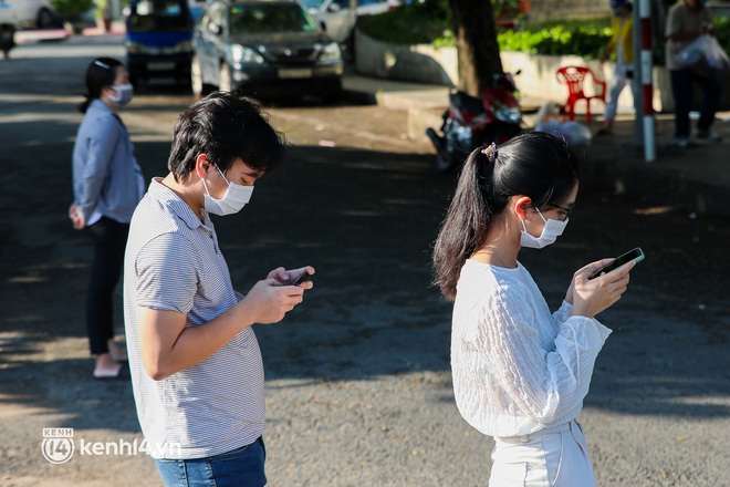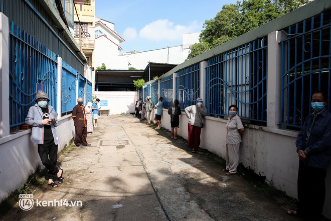 Nhiều người dân xếp hàng dài chờ đợi. Bảo vệ chỉ cho 10 người vào mỗi lượt nên nhiều người buộc phải chờ đến lượt
