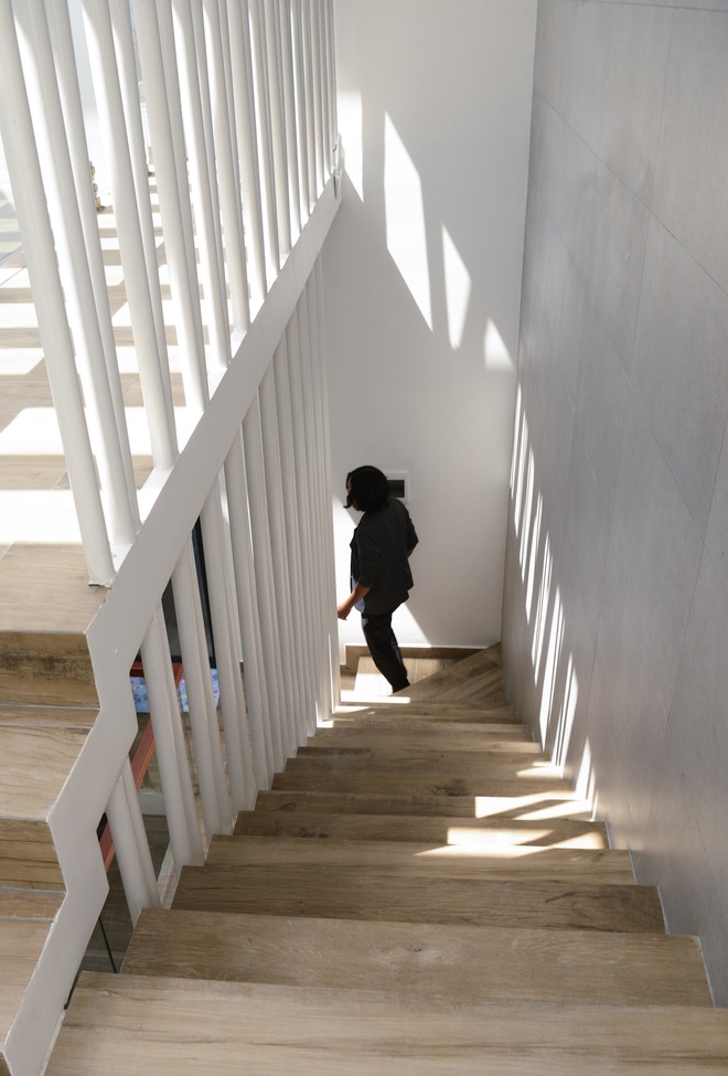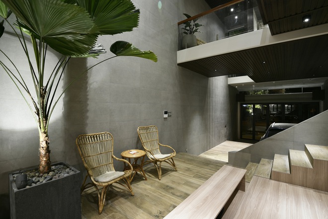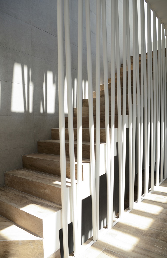Khoảng cầu thang gỗ nhấn thêm những nét mềm mại trong một không gian sống hiện đại và có đôi phần góc cạnh