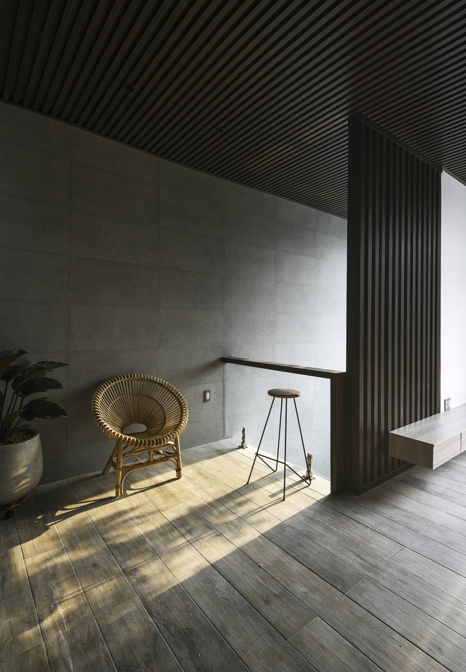 Gam màu chủ đạo của ngôi nhà thiên về sắc tối và màu mộc từ các chất liệu gỗ. Những màu sắc này đem lại sự gần gũi, một chút tùy hứng và quan trọng hơn cả là toát lên được sự mạnh mẽ trong thiết kế. Những bức tường thô nhám phối trộn với chút mềm mại từ vật liệu gỗ, tổng thể ngôi nhà trông khá tối giản nhưng không thiếu sự tiện nghi và đẳng cấp.