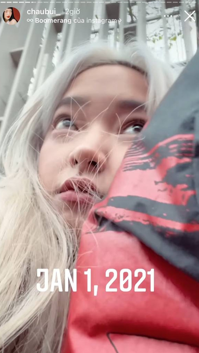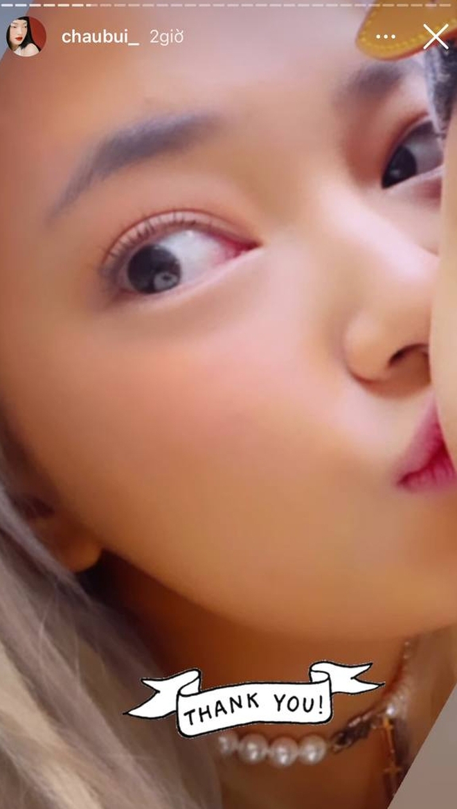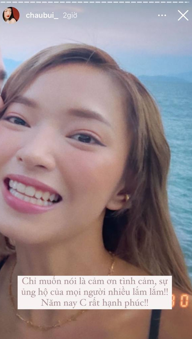 Cụ thể, nhân dịp có chuyến du hí cuối năm, Châu Bùi đã chiêu đãi netizen liền tù tì 3 chiếc story "úp mở". Một cái thì cô tựa vào vai người đàn ông nào đó, 2 tấm còn lại thì Châu Bùi và người đó hôn má nhau. Netizen tất nhiên lập tức đoán thẳng, chẳng cần đoán già đoán non đó là Binz. Trên story, Châu Bùi cũng viết đôi ba dòng sến súa kiểu như: Chỉ muốn nói là cám ơn tình cảm, sự ủng hộ của mọi người nhiều lắm. Năm nay của Châu rất hạnh phúc.